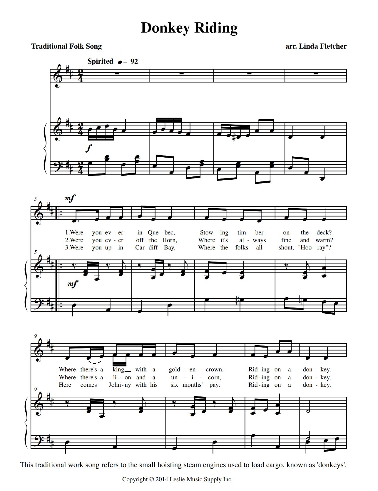 Teaching strategy: Singing rhythmically in 2/4, dynamic contrasts, storytelling. Research the “donkeys”, the history of logging and the places mentioned in the song. The optional harmony on the chorus is a good introduction to singing with a partner.